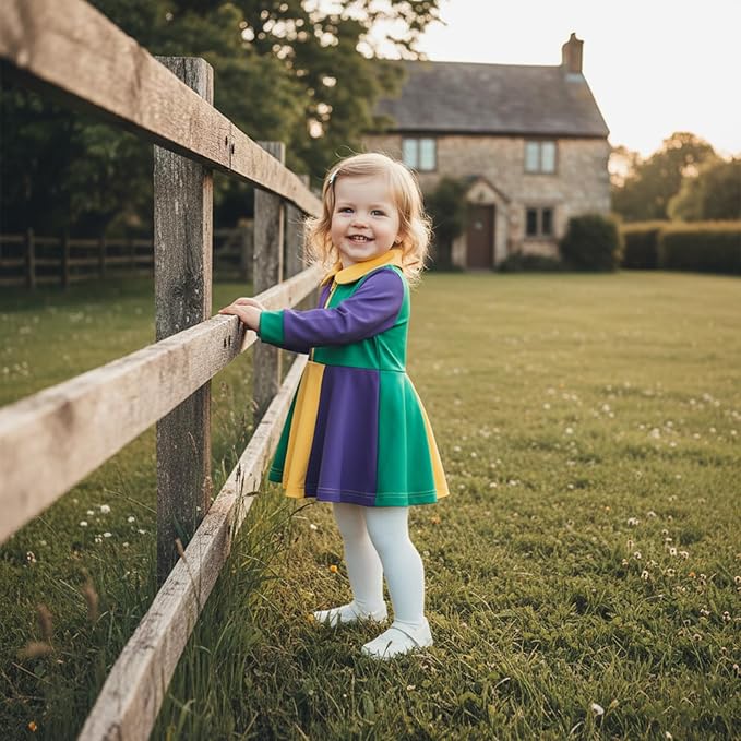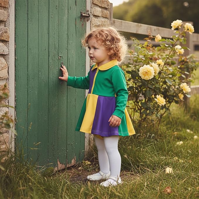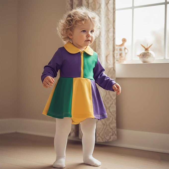 • Design: My first mardi gras baby girl outfit, doll collared zipper-up patchwork a line jumpsuit dress, purple yellow green color block long sleeve romper dress for baby girls, contrast color half zipper lapel neck bodysuit with pleated tutu skirt, first Mardi Gras baby girl dress, carnival baby girl outfit, infant girl carnival clothes