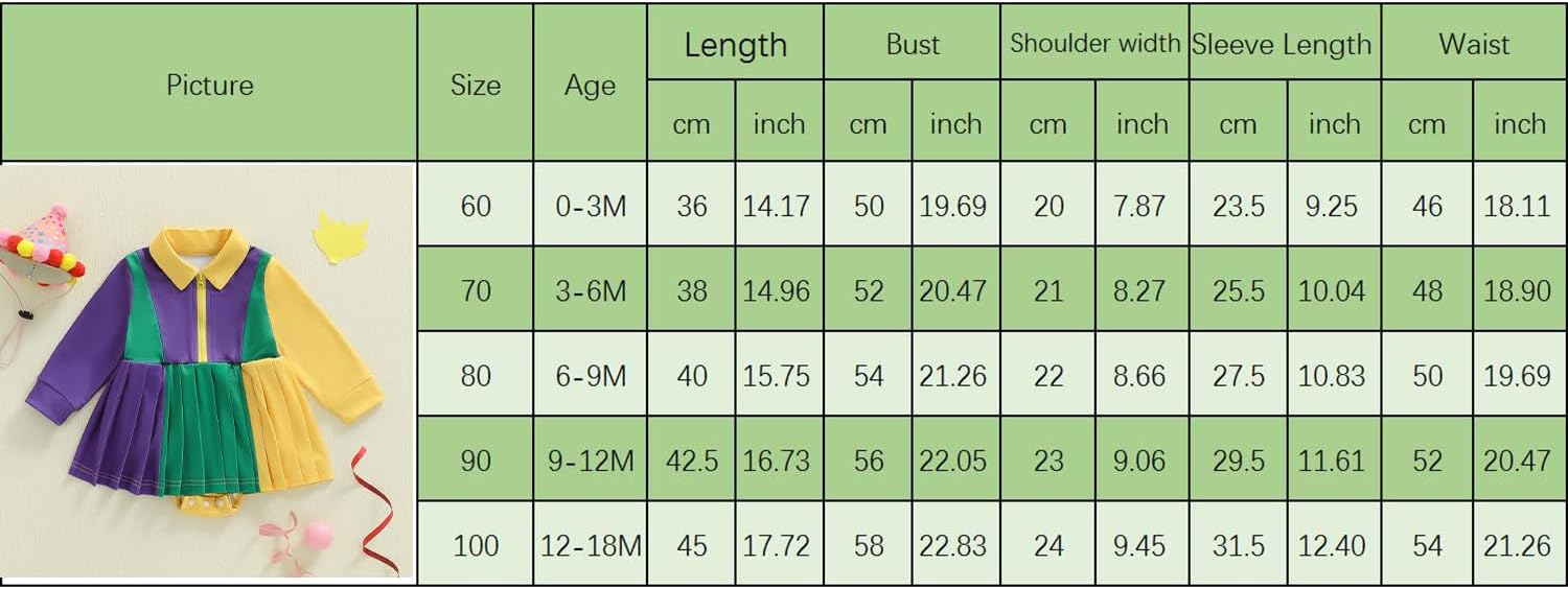 • Size: Mardi Gras baby girl clothes 0-3 months, 3-6 months baby girl Mardi Gras clothing, infant girl Mardi Gras carnival outfit6-9 months, carnival baby girl clothes 9-12 months, 12-18 months baby girl long sleeve patchwork romper dress